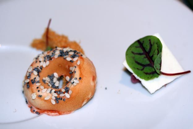 The meal was just delightful. We all immediately decided on the tasting menu, and allowed the Chef to take us on his little journey of flavors. We enjoyed such things as (lox & bacon title). This dish was memorable in that the bagels themselves were ice cream, and the lox was a freeze dried meat. The dish was cold, but the flavors were vivid, intense and appealing, which would seem impossible in such a presentation. While every dish was a journey in twisted sensation, the BH found the (bearnaise & beef title) among the most clever. It was a complete reversal of the expected, with the beef arriving in the form of a broth and the bearnaise sauce the form of a solid. The fact that it was delicious an added bonus in the amusement. From the first amuse bouche to the last dessert, which was something called a chocolate packet (you gotta taste one, I won’t spoil the surprise here), every dish was beautifully prepared, creatively plated and an achievement in artistry unlike any other I had tasted. If you enjoy food and it’s preparation, you simply haven’t lived until you’ve visited WD-50.